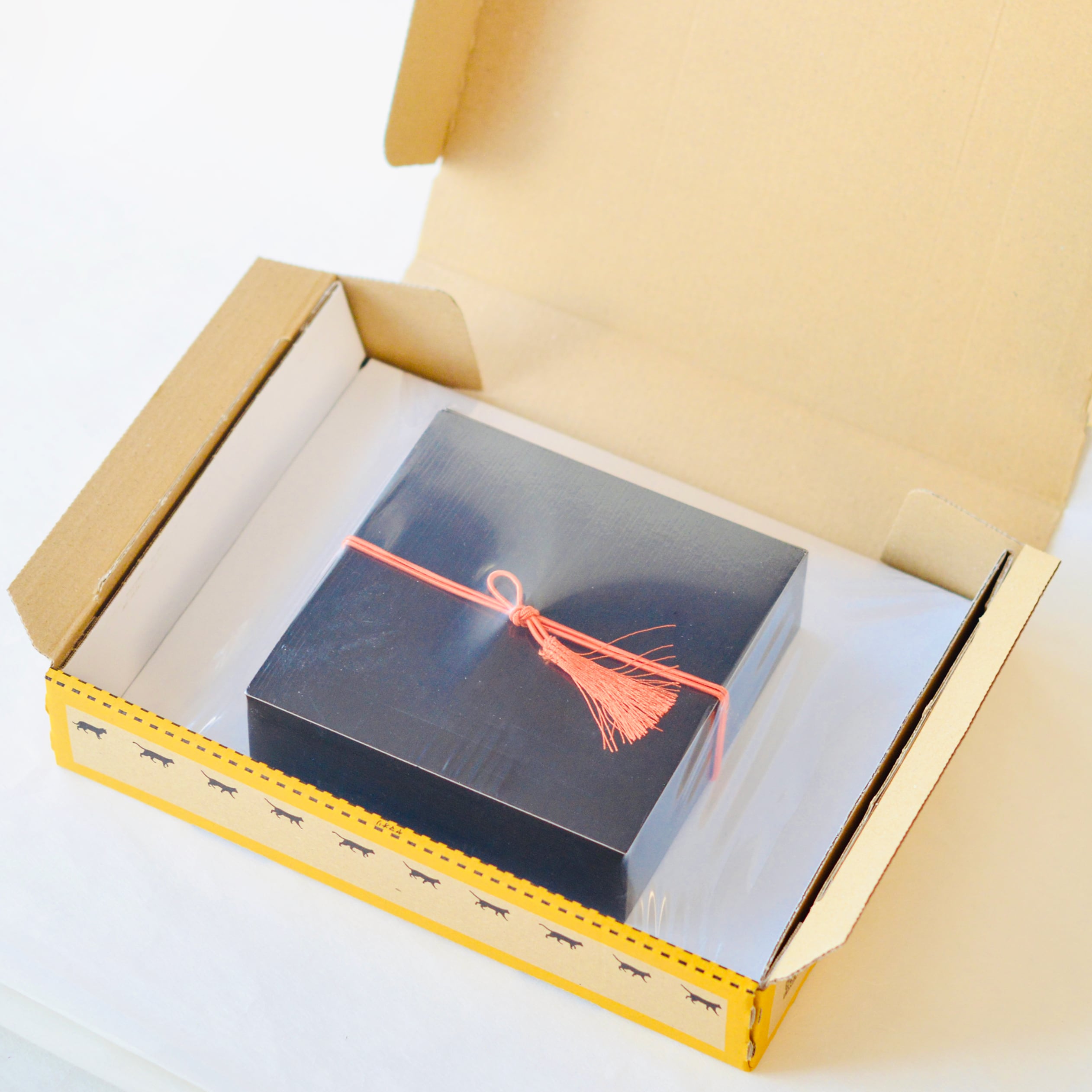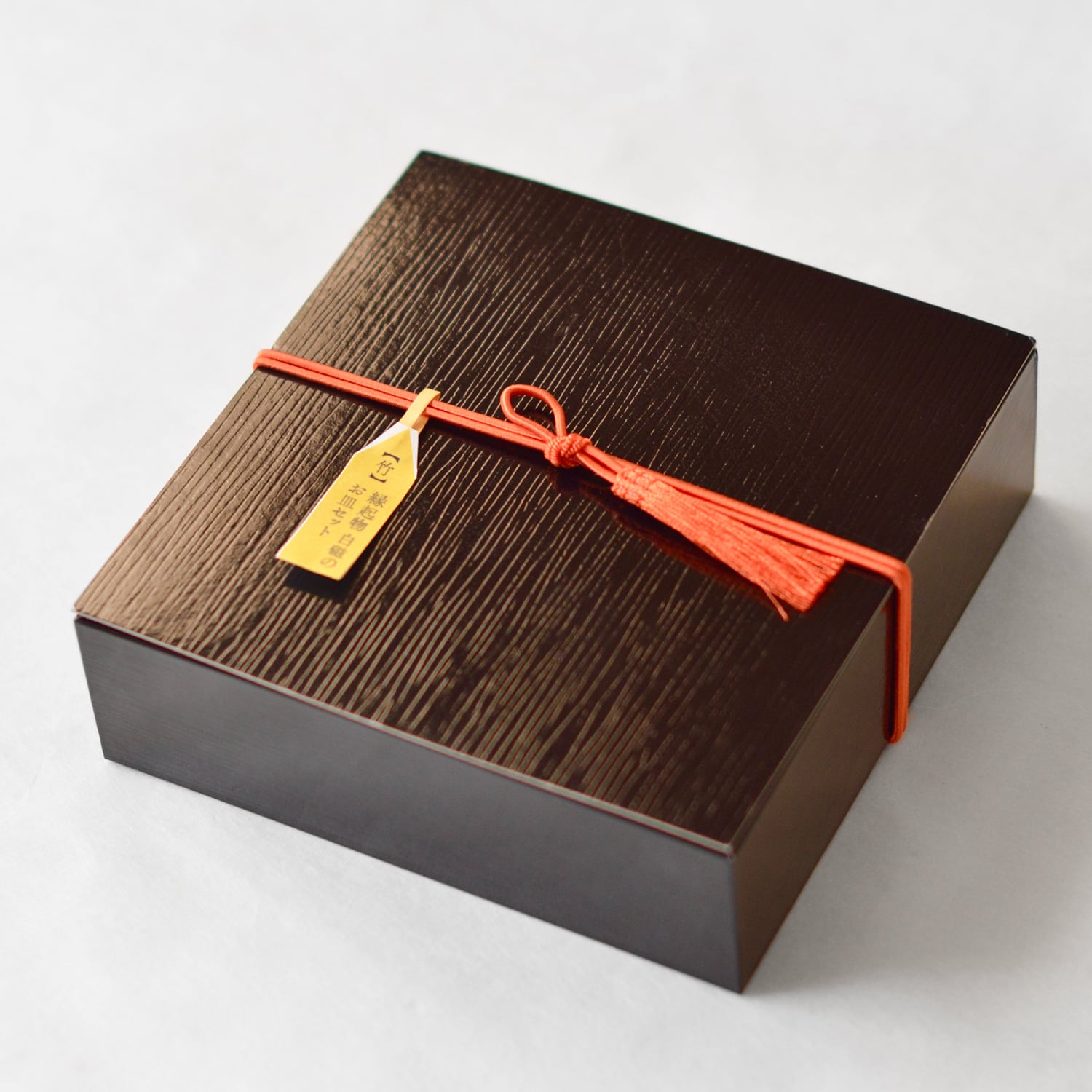シックな和の色合いの黒箱に、房がけのラッピングでお届けいたします。