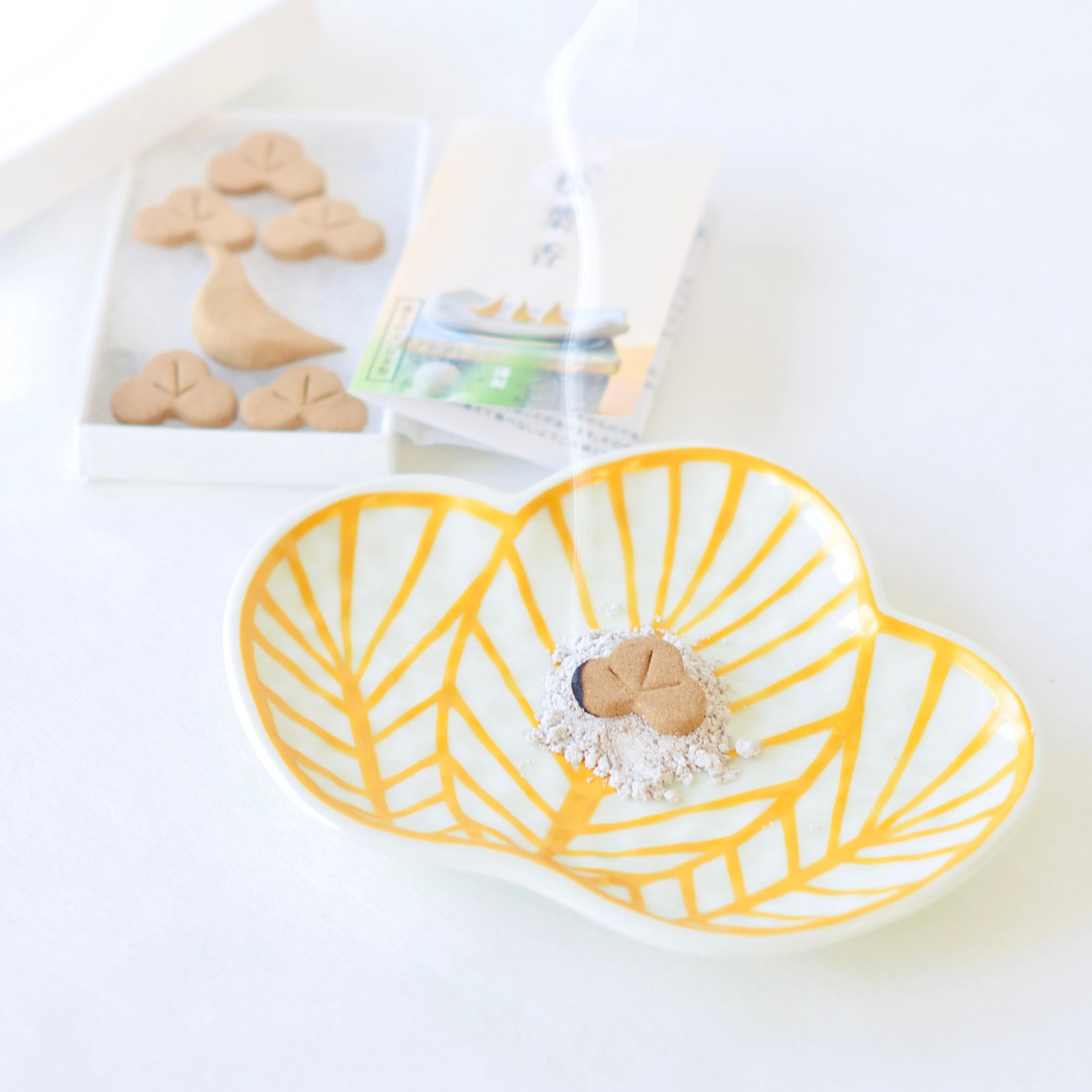 縁起の良い松形と季節の形のお香9個に、有田焼の美しい松葉型お香皿のセットです。